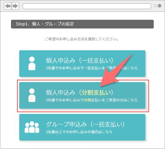 お申し込み画面から「個人申込み(分割支払い)」を選択してお手続きください。お申し込みはせずに、分割回数や1回のお支払金額を確認したい場合は、お申し込み手続きを完了させないでください。