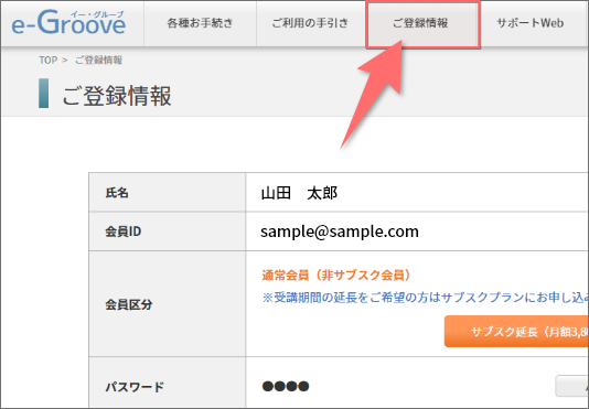 画面上部にある「ご登録情報」ボタンをクリックすると、お申し込み時の情報を確認することができます。パスワードやメールアドレスの変更、受講期間の延長(サブスク延長)のお手続きなども行うことができます。