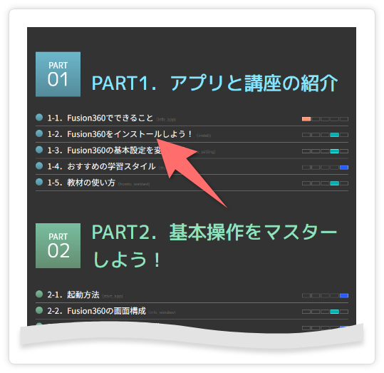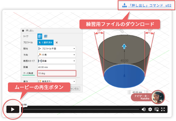 学習を進めると、操作方法を紹介した解説ムービーが多数登場します。練習用ファイルもダウンロードできるので、ムービーに合わせて実際に操作練習しながら、快適に学ぶことができます。
