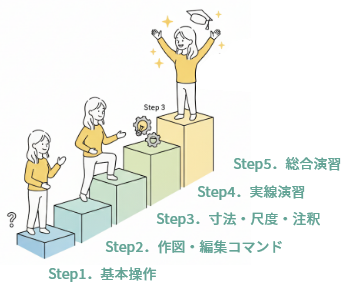 学習カリキュラムは、初心者の方でも安心してステップアップできるよう構成されています。まずは「線を描く」「削除する」「円を描く」といった基礎操作から楽しくスタート!その後、徐々に実践的な内容へと進んでいくので、未経験の方も無理なくCADスキルを習得できます。