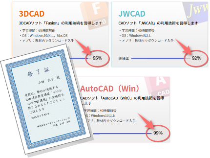 JWCAD、AutoCAD、3DCADのすべての学習進捗率が90%を超えた場合に発行が可能となります。